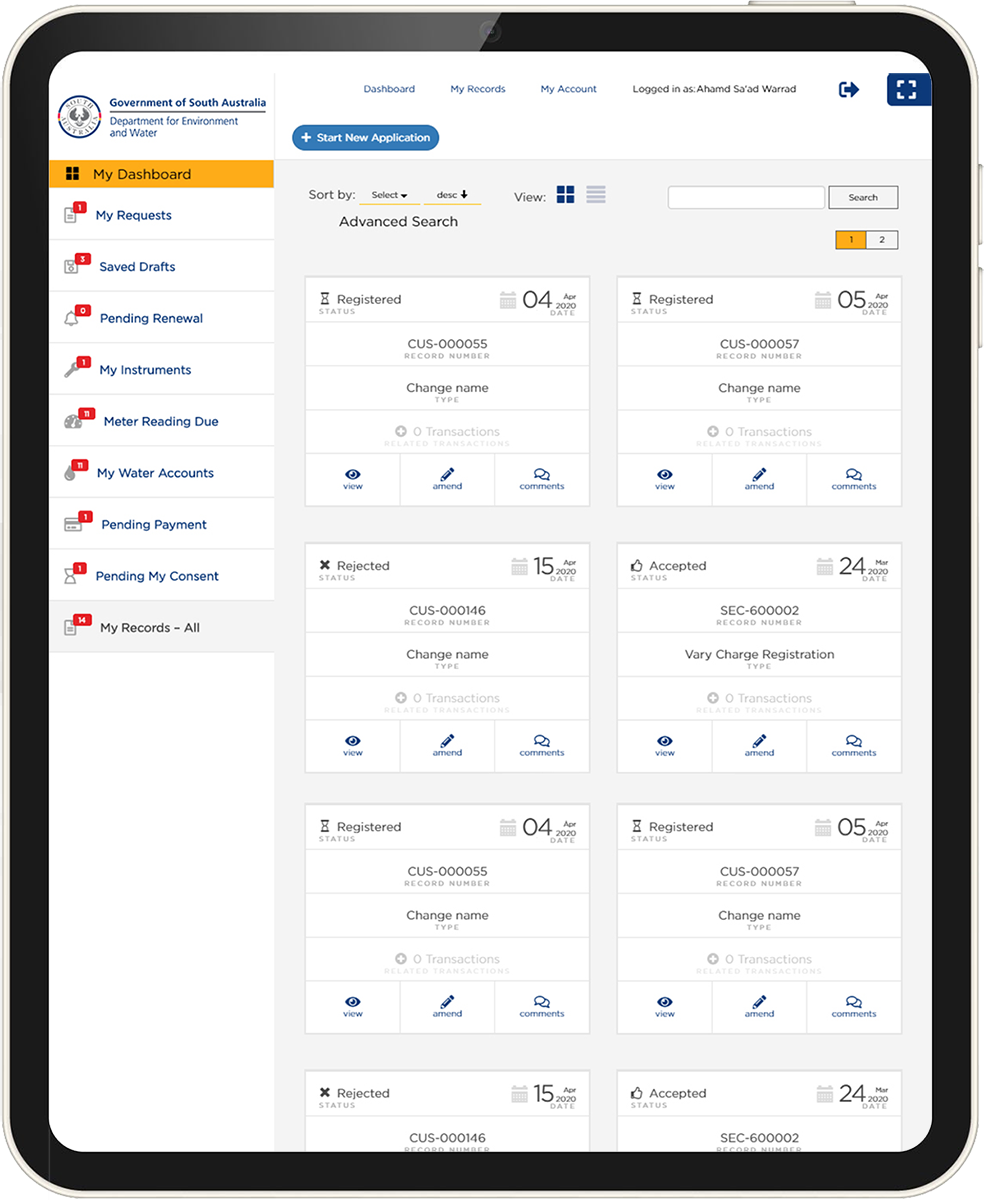 Australia's DEW required an intuitive, smooth, responsive online portal for their citizens, that would allow users to submit, save, search, and retreive and display applications & requests, as well as handle notifications and modifications. I contributed as the principal developer and designer, by developing a range of reuseable full stack components to handle the requested features, and designed the theme for the ePortal.